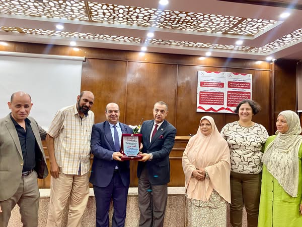وفي نهاية الاحتفال تقدموا بدرع تذكاري لسعادة الأستاذ الدكتور/أحمد حسني إبراهيم عميد الكلية ذلك تقديراً وإعترافاً بمجهوداته خلال فترة عمادة بالكلية
