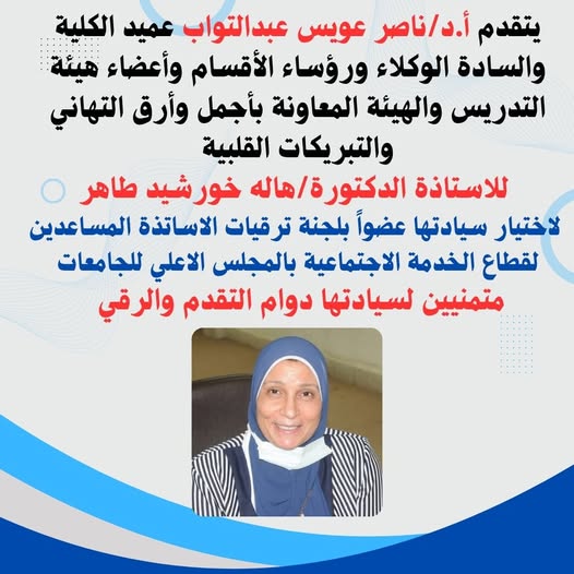 تهنئة الاستاذ الدكتورة/هالة خورشيد لانضمام سيادتها للجنة ترقيات الاساتذة المساعدين