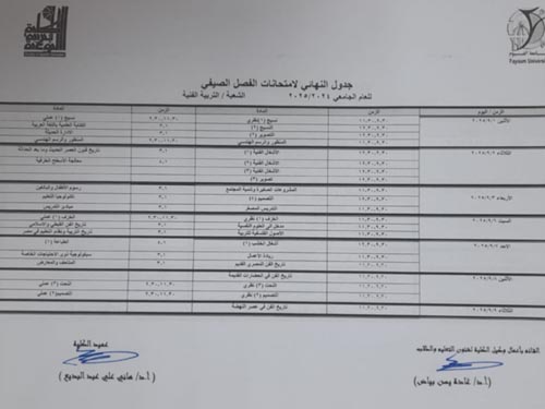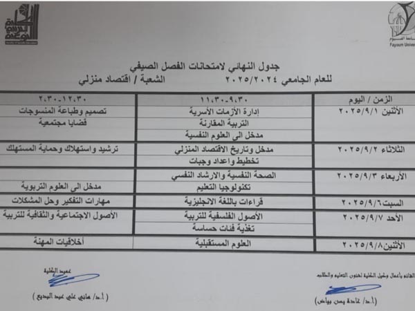 نشر جداول إمتحانات الفصل الصيفي الثلاث أقسام ( الاقتصاد المنزلي - التربية الفنية - تكنولوجيا التعليم )